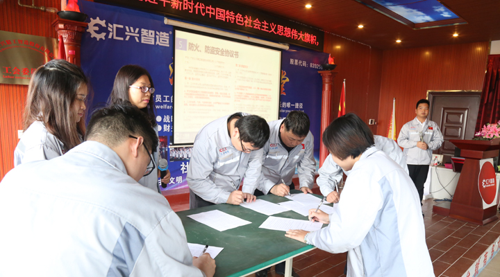 璞玉有瑕,有先進(jìn),就有落后,有表揚,就有懲戒。沒有規(guī)矩,不成方圓,所以大會的第四個議程對公司管理制度做了進(jìn)一步宣講和引導(dǎo)。人事經(jīng)理袁侃結(jié)合實際案列,諄諄告誡全體員工遵守法律、行政法規(guī)、公司制度,不要以身試法、以身犯險。并發(fā)起第五個會議議程,倡議匯興智造全體員工簽訂《防火、防盜安全協(xié)議書》,各部門負(fù)責(zé)人率先上臺在協(xié)議書上簽字,用實際行動表決心。