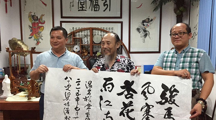 7月28日晚22點,興國縣委常委副縣長溫巖松,方太鄉黨委書記江華,水利局局長王捷等一行七人蒞臨我司指導,秋風塞上比擬著溫副縣長的遠程走訪,像春雨滋養著大地,匯利興集團(現更名:廣東匯興精工智造股份有限公司,簡稱:匯興智造)董事長鐘輝陪同,邂逅到訪的嶺南畫派泰斗梁培浩教授,并與梁老進行深刻的藝術交流。