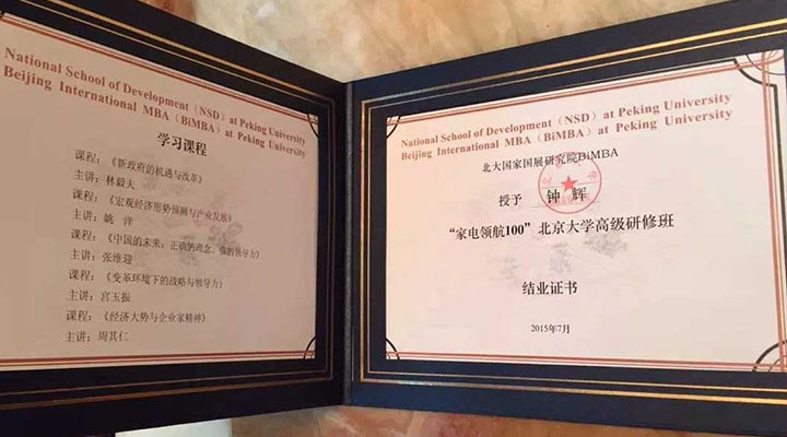 同時(shí),經(jīng)過(guò)一年的學(xué)習(xí)和相處,“家電領(lǐng)航100”北大班的同學(xué)們迎來(lái)了結(jié)業(yè)的日子。匯利興集團(tuán)董事長(zhǎng)鐘輝為此次畢業(yè)學(xué)員,中國(guó)慧聰家電城董事總經(jīng)理宋冰晨先生為“家電領(lǐng)航100”北大班的同學(xué)們頒發(fā)結(jié)業(yè)證書。