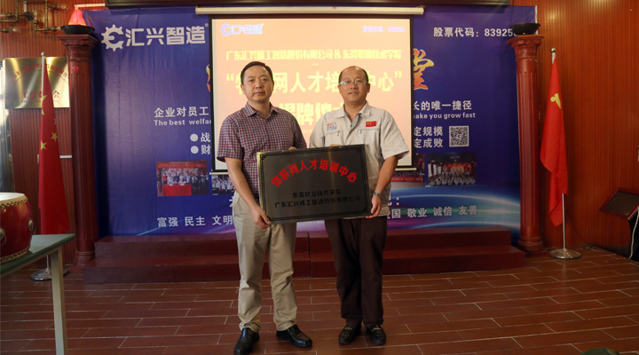 2017年9月27日下午, 東莞職業(yè)技術學院副院長楊云奇,計算機工程系主任胡選子博士,藝術設計系主任何鳳梅博士,計算機系曹文梁教授等專家人員一行蒞臨廣東匯興精工智造股份有限公司(股票代碼:839258)考察調(diào)研并舉行“物聯(lián)網(wǎng)人才培訓中心“基地揭牌儀式。匯興智造董事長鐘輝,匯興中德智能制造研究院院長李康順教授熱情接待了調(diào)研組一行。