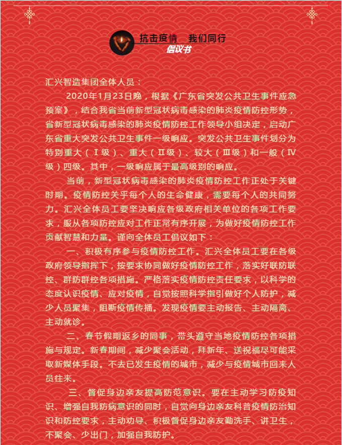 抗擊疫情,我們在行動!匯興智造給全體員工、客戶的一封信. 2020-02-19